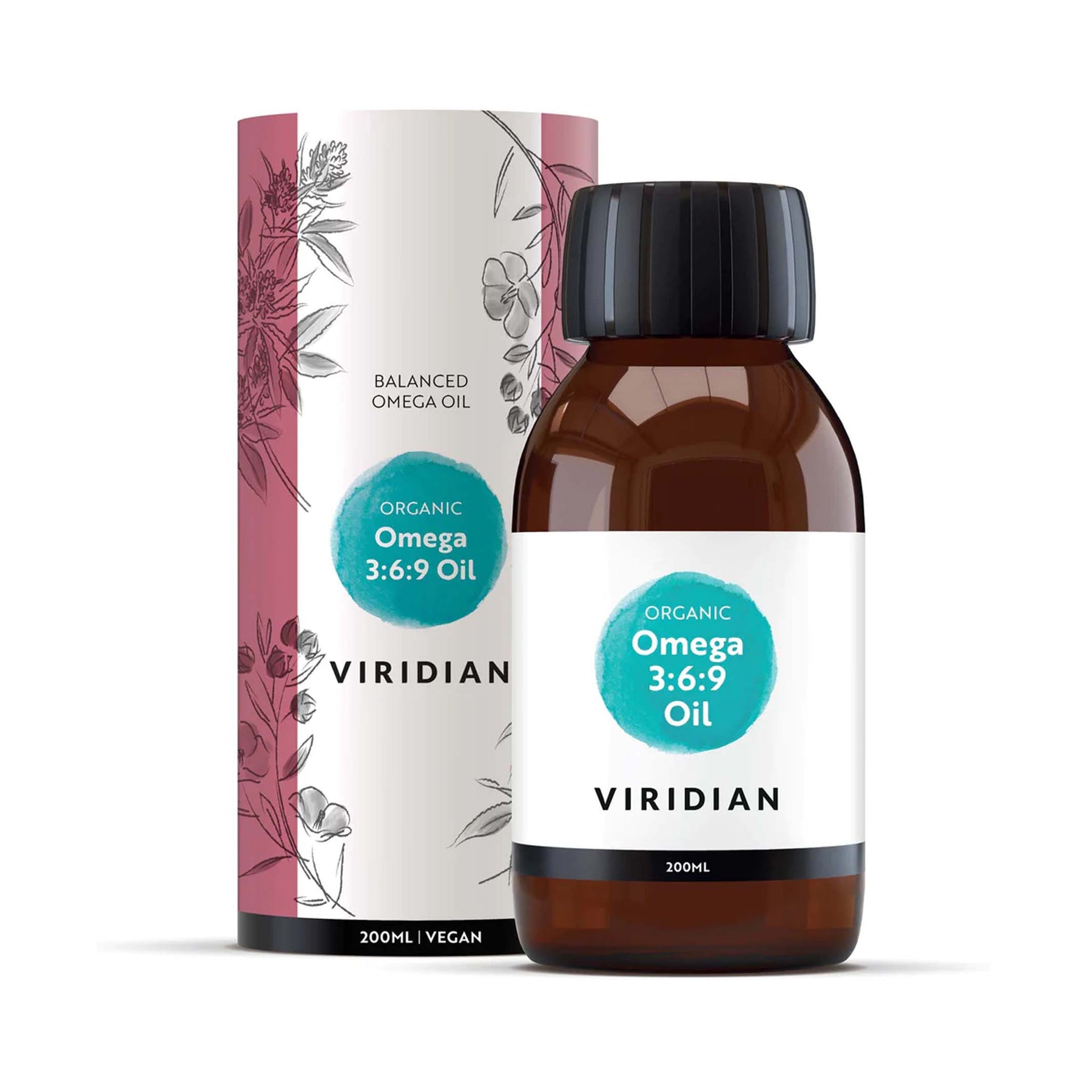 Bottle of omega 3:6:9 oil with the viridian logo on. Viridian packaging tube behind on a white background